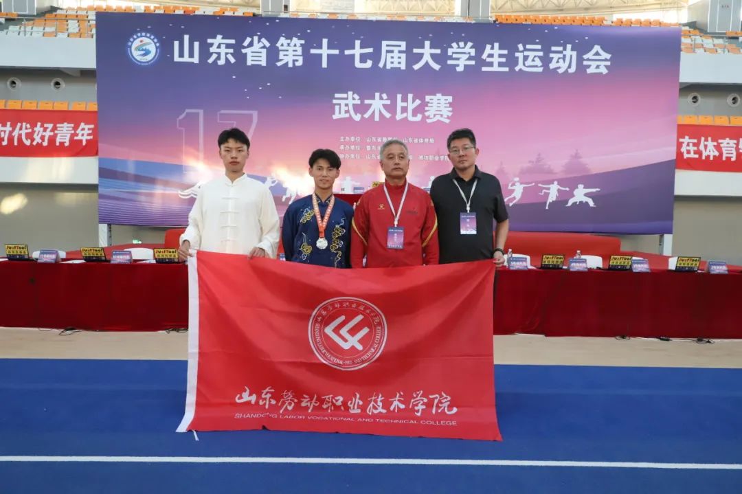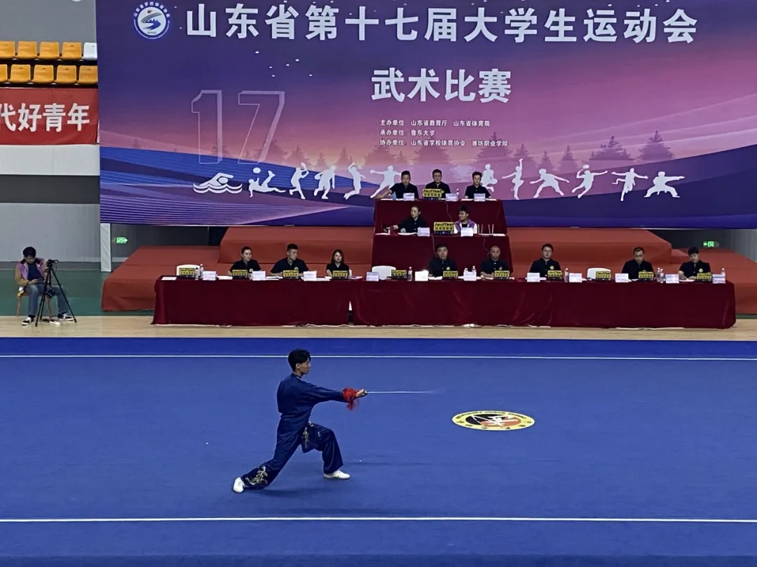 9月20日至25日,山东省第十七届大学生运动会武术比赛在潍坊职业学院体育馆举行,我院武术代表队在基础(体育)教学部张淼副主任及赵为民老师的带领下参加了比赛,最终汽车工程系刘献尊同学取得了乙组太极拳第二名、乙组太极剑第五名,苏晓鹏同学取得乙组太极剑第七名,两人还取得乙组对练第七名的好成绩,学院获得体育道德风尚运动队荣誉。这是我院第一次参加山东省大学生运动会武术比赛,并获得奖牌。